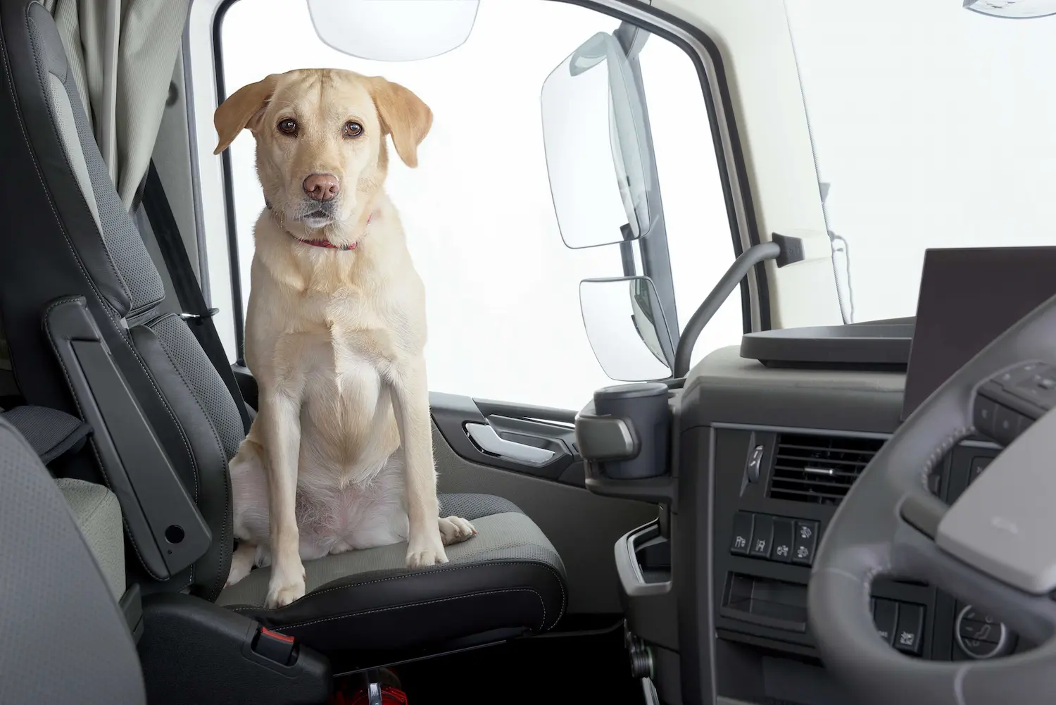 クライアントからのリクエストで、ワンちゃんを助手席に座らせたカットを撮影しました。ただ、トラックは普通車よりも運転席の位置が高いため、抱えて座らせられるような高さではないんですね。