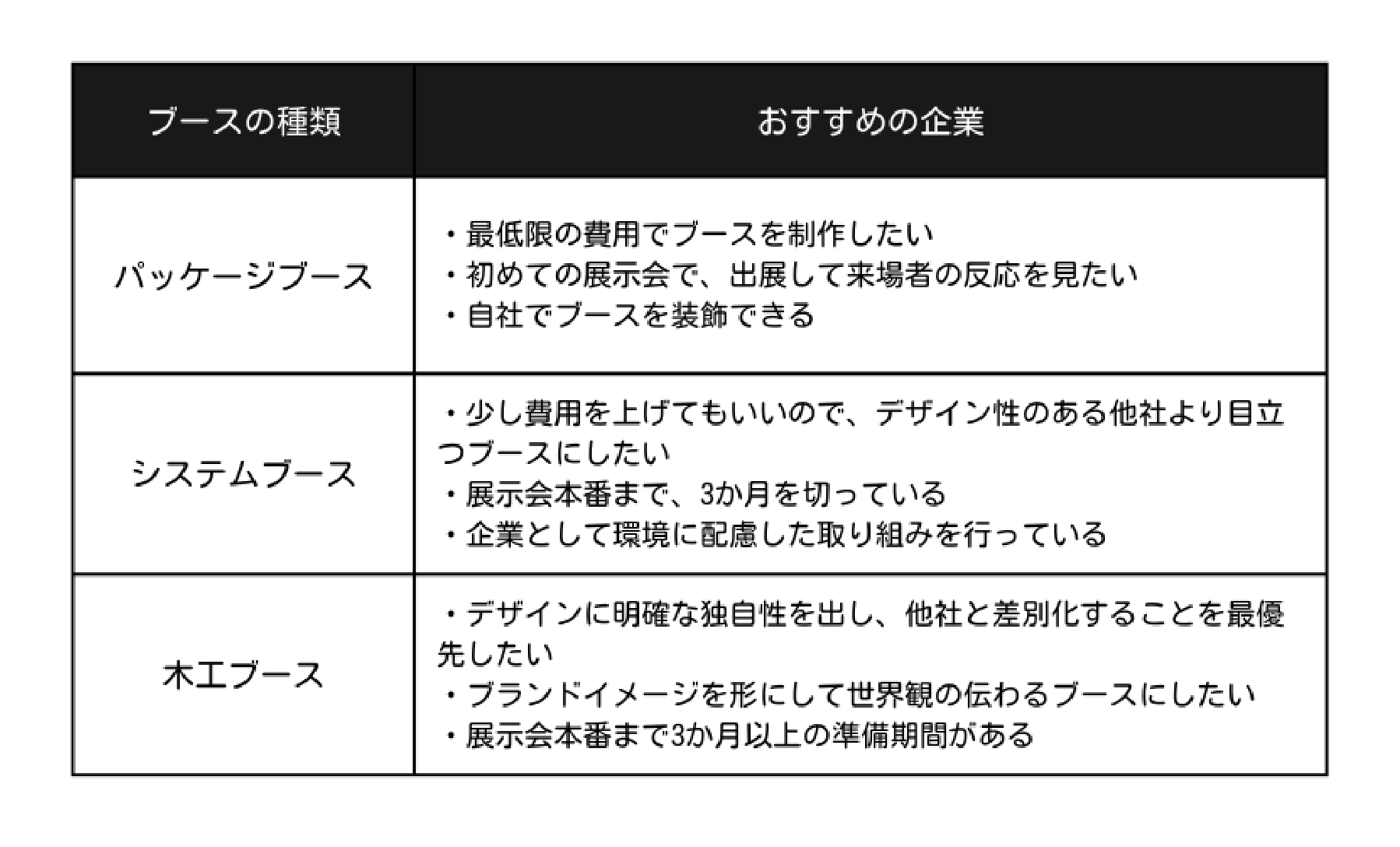 そこでこの章では、ブースの種類別に、どのような企業におすすめかを解説します。
