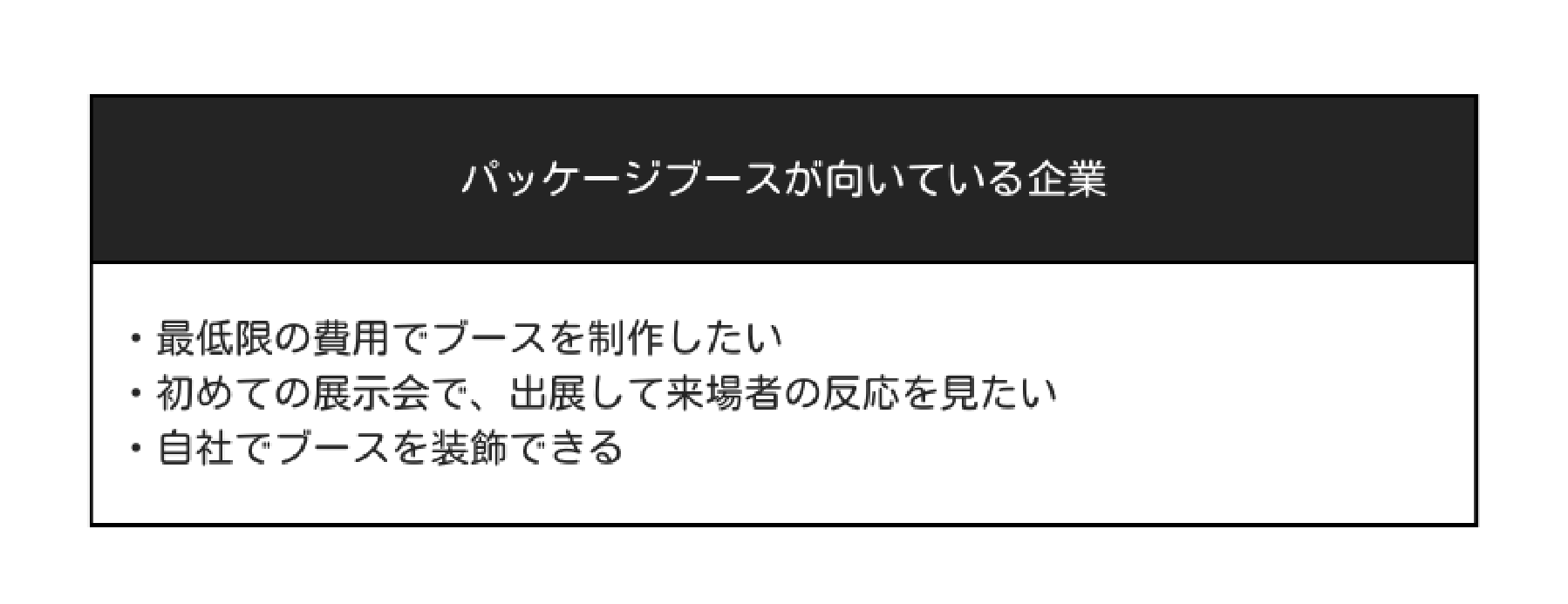 パッケージブースは、標準的なブース設備を安く利用できるため、以下のような企業に適しています。