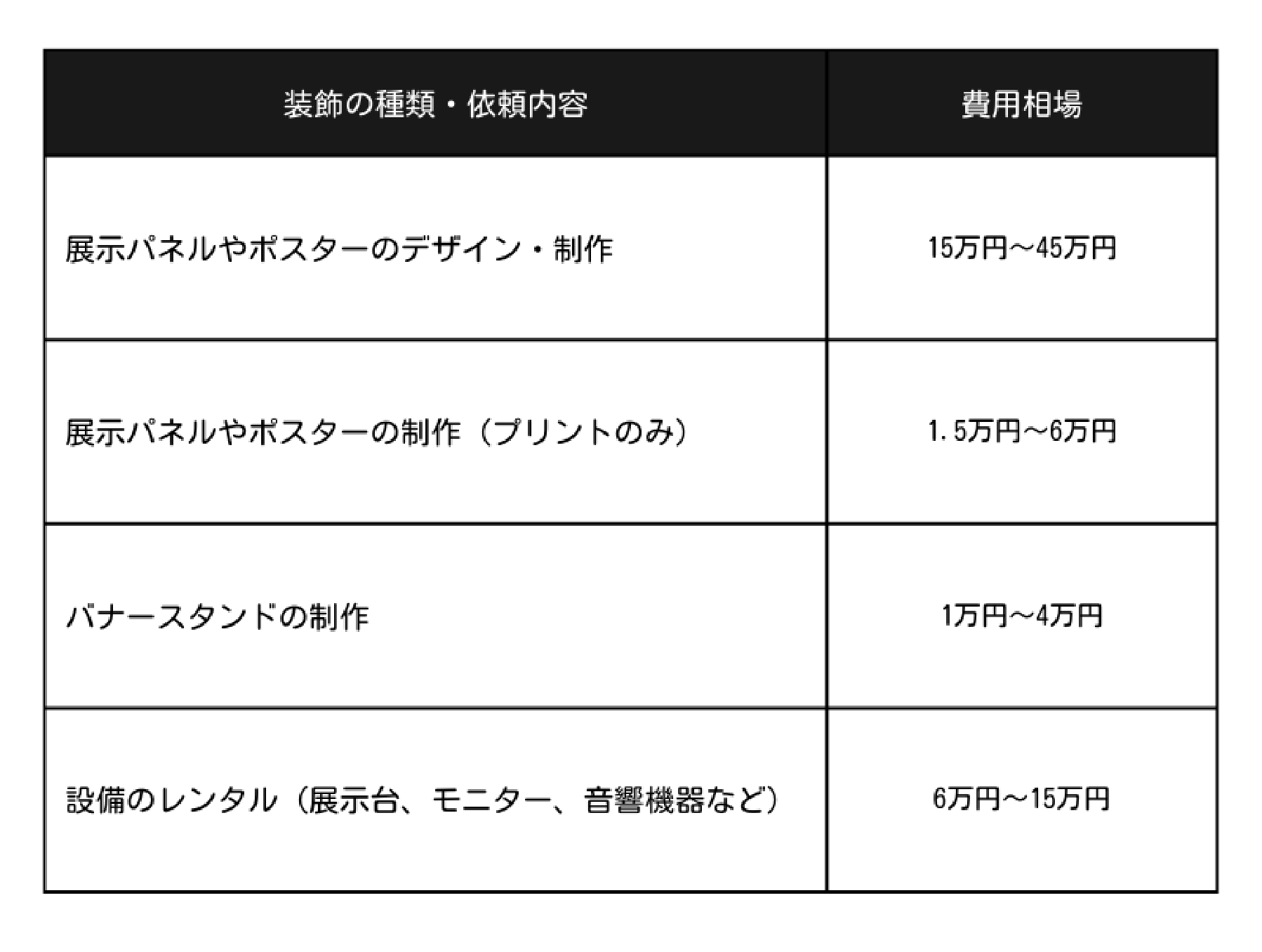 ただし、装飾に多くの費用をかけてしまうと、パッケージブースで費用を抑えたメリットが薄まります。参考までに、装飾に使うアイテムを外注する場合の費用相場は以下のとおりです。