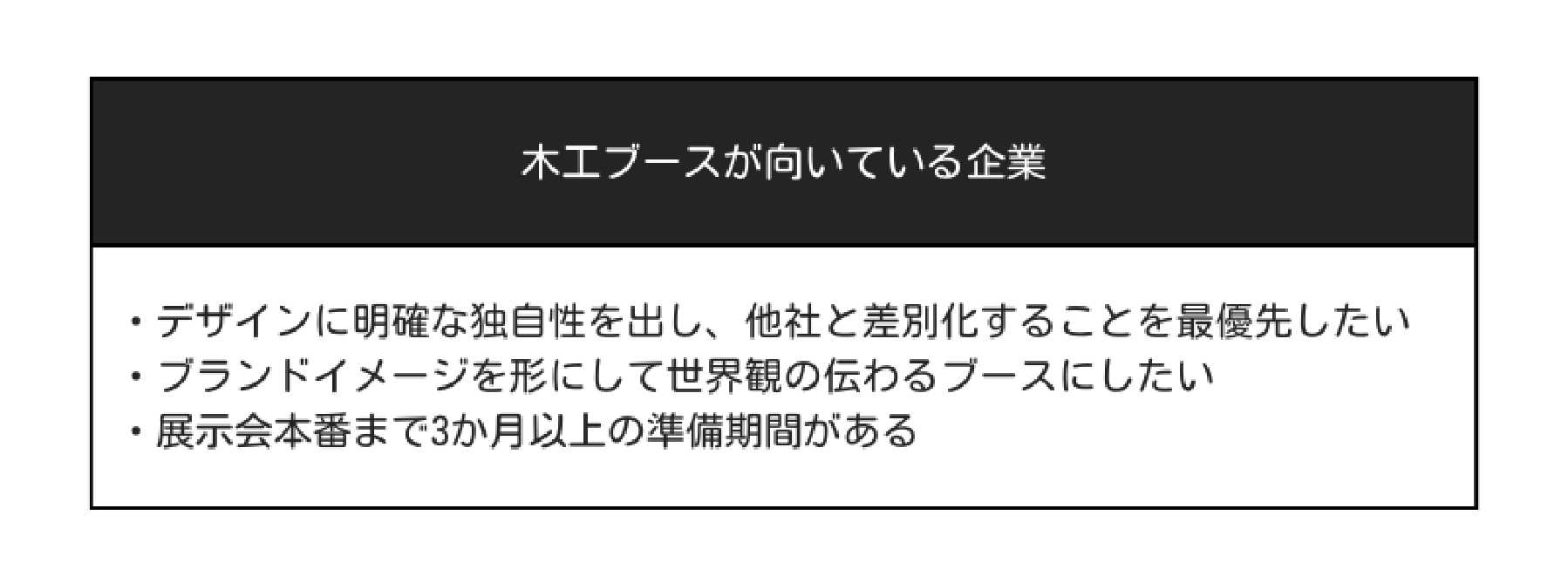 木工ブースは、 オーダーメイドのデザインで他社との差別化を図りたい企業に適しています。