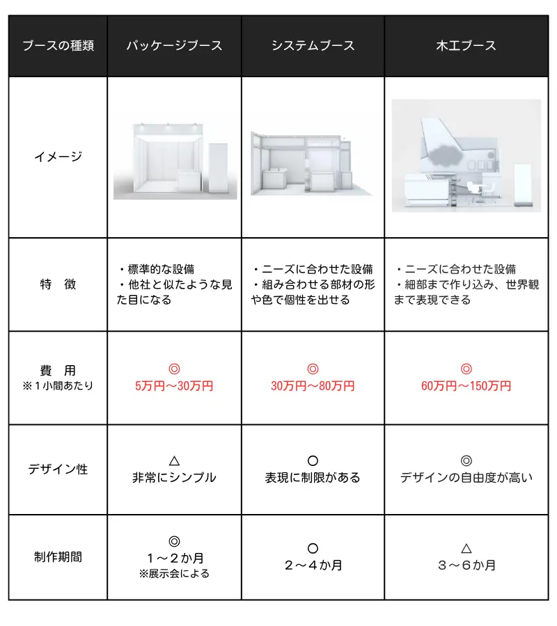 次の表は、ブースの種類とそれぞれの費用相場、特徴をまとめたものです。